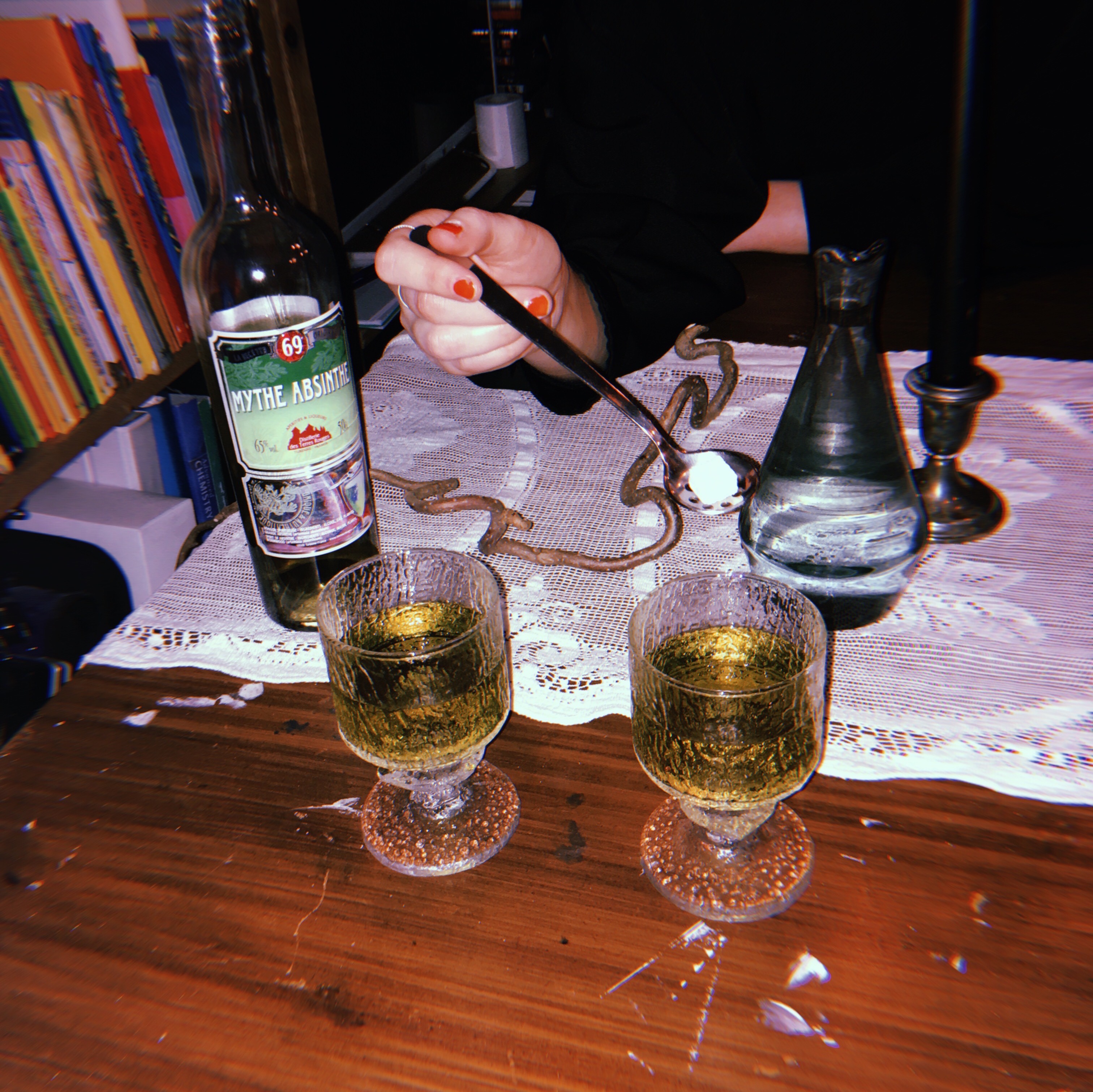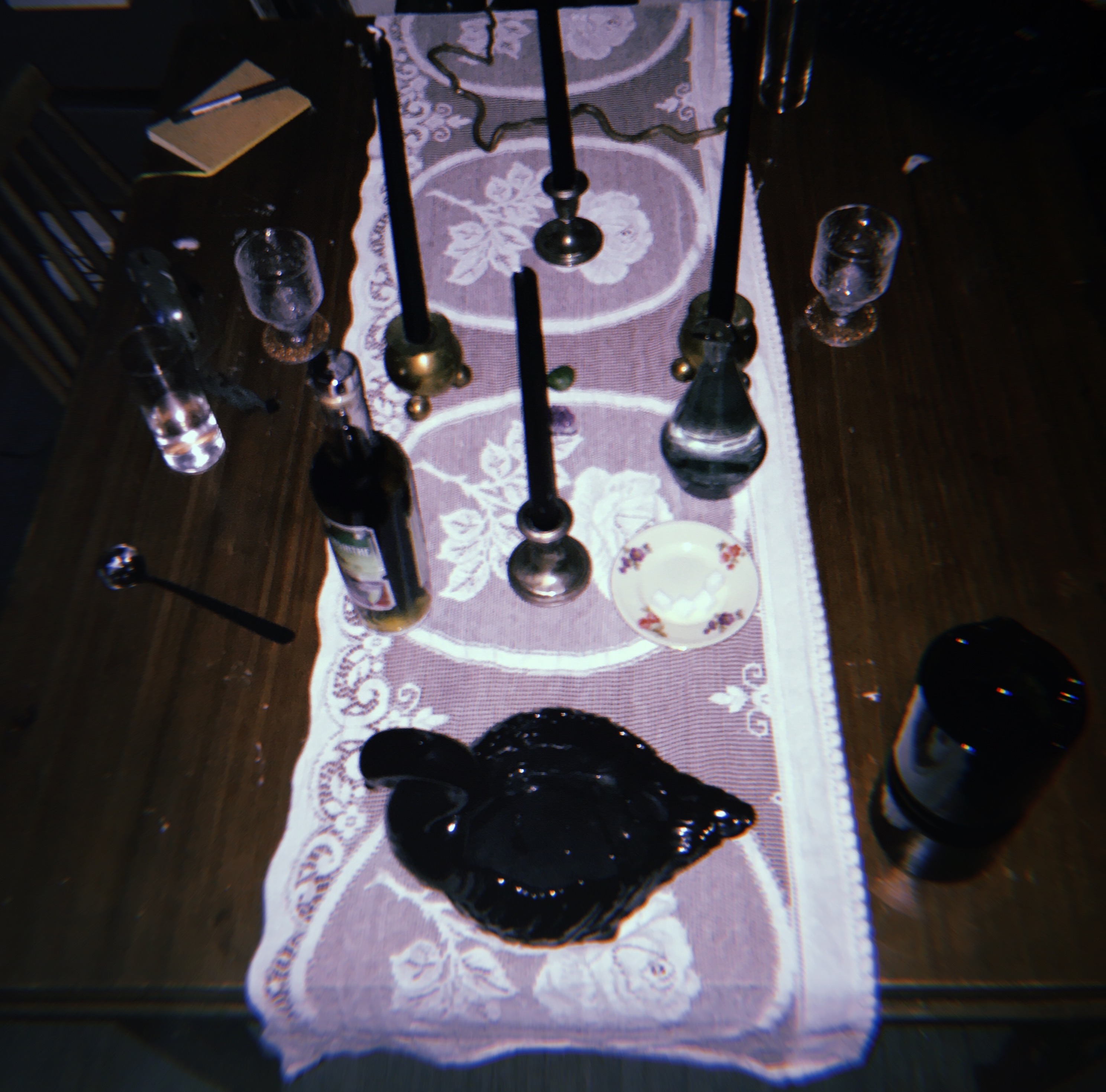Across from me Anna wears all black. It is Easter. The witches are entering Blockula. In the middle of the table there is a black swan. To the left of the swan a small porcelain plate with a motif of wildflowers. On top of the plate is a pile of sugar cubes. In the middle of the table four black candles, two stones, a bottle of absinthe, and a twig are spread out on top of a lace rose altar cloth. Anna is writing as a piano note repeats itself. Unknown voices whisper over one another in crescendo. Sitting near her I am another me. The me she has never met. The me she will never meet. The music reaches a break of bells.